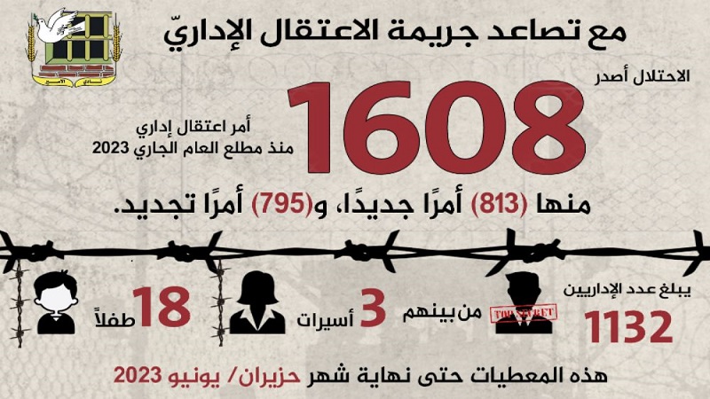 وأكد نادي الأسير، في بيان، اليوم الخميس، أن هذه الأعداد لم نشهدها منذ 20 عامًا، إذ أصدر الاحتلال حتى نهاية حزيران 1608 أوامر، منها 813 أمرًا جديدًا، و795 أمر تجديد، وخلال الشهر الجاري، أصدر الاحتلال العشرات من أوامر الاعتقال الإداري، التي طالت بشكل أساسي معتقلين سابقين أمضَوا سنوات في سجون الاحتلال، ومنها الاعتقال الإداري، إضافة إلى أن جيلًا جديدًا، بدأت سلطات الاحتلال باستهدافه.