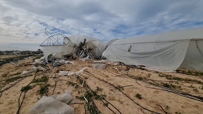 وقالت إن نحو 70% من البيوت البلاستيكية الزراعية دُمّرت بالكامل، فيما تضررت غالبية الآبار، ما جعل الوصول إلى المياه شبه مستحيل، وأدى إلى انهيار شبه كامل في منظومة الإنتاج المحلي داخل القطاع.