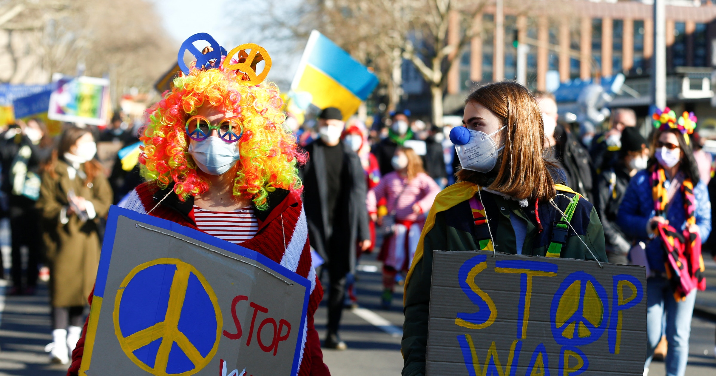 وفي مدريد، احتشد المئات أمام متحف الملكة صوفيا، ورفع البعض لافتات كُتب عليها "السلام"، وضع آخرون شرائط باللونين الأصفر والأزرق وهي ألوان العلم الأوكراني.