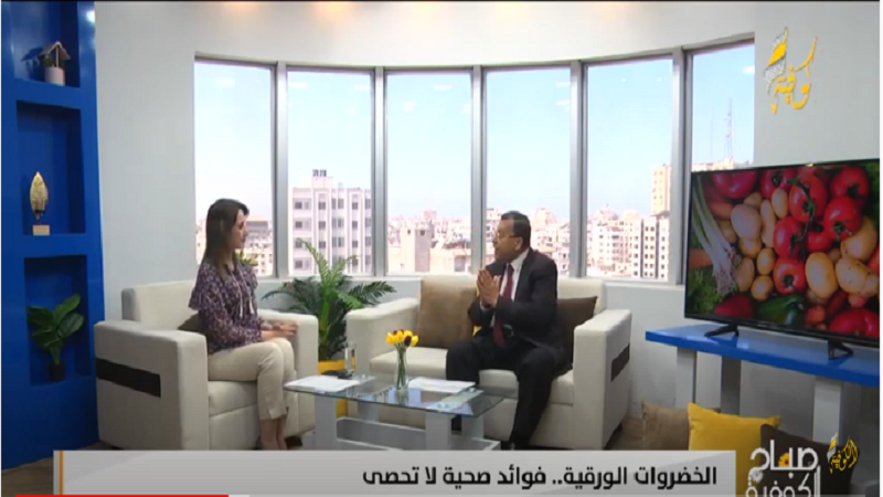وأضاف عمارة، خلال لقائه على شاشة "الكوفية"، أن الخضروات الورقية تعتبر مصدر مهم لمضادات الأكسدة والتي تحمي القلب وتقاوم الدهون والكولسترول.