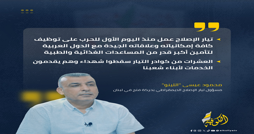 وأضاف العميد "اللينو" في تصريحات خاصة لـ"الكوفية"، بأن تيار الإصلاح عمل منذ اليوم الأول للحرب على توظيف كافة إمكانياته وعلاقاته الجيدة مع الدول العربية لتأمين أكبر قدر من المساعدات الغذائية والطبية في غزة.